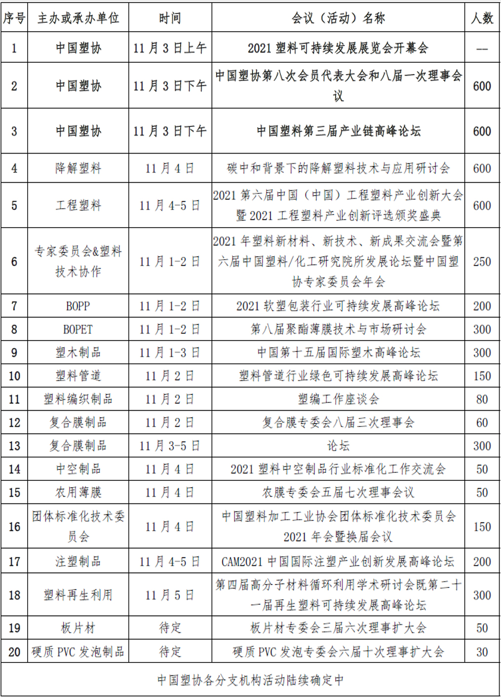 四、系列活动目不暇接,专业观众四海毕至。为丰富展会内容,增强各方交流效果,更加精准地实现对接合作,展会期间还将同期召开多场国塑料可持续发展系列活动其中包括以可持续发展为主题的论坛、峰会、交流会、研讨会,以分支机构工作为核心的子行业年会、理事会议,以及市场对接活动和专业培训等活动,其中,降解塑料专委会的碳中和背景下的降解塑料技术与应用研讨会、塑料再生利用专委会的第四届高分子材料循环利用学术研讨会第二十一届再生塑料可持续发展高峰论坛、工程塑料专委会的2021第六届中国工程塑料产业创新大会等盛会,将为参展商、观众带来大量新的绿色创新成果产品、技术和市场信息。