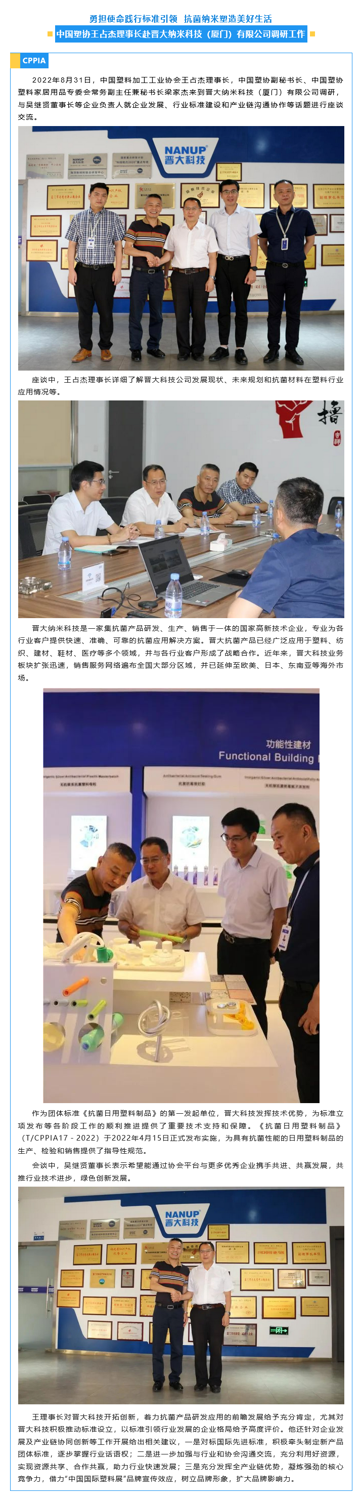 中国塑协王占杰理事长赴晋大纳米科技(厦门)有限公司调研工作