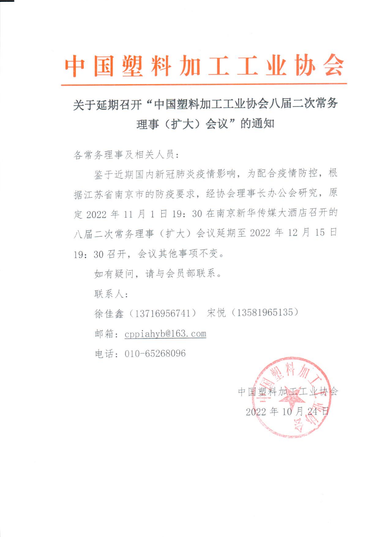 关于延期召开“中国塑料加工工业协会八届二次常务理事(扩大)会议”的通知