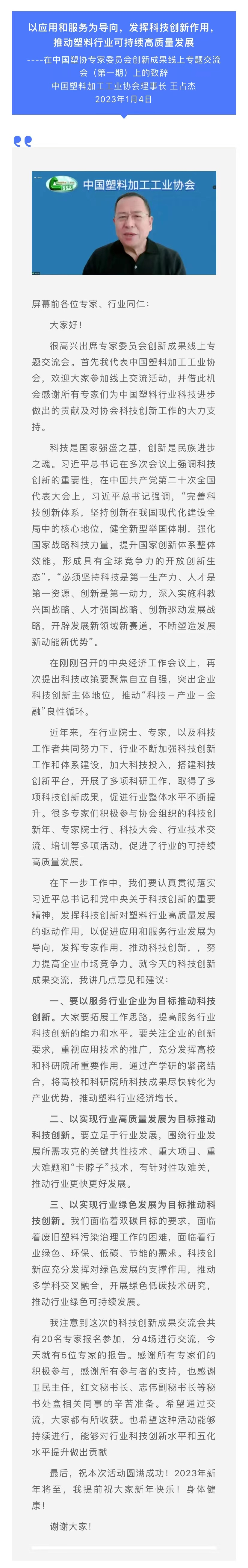 王占杰理事长在中国塑协专家委员会创新成果线上专题交流会(第一期)上的致辞