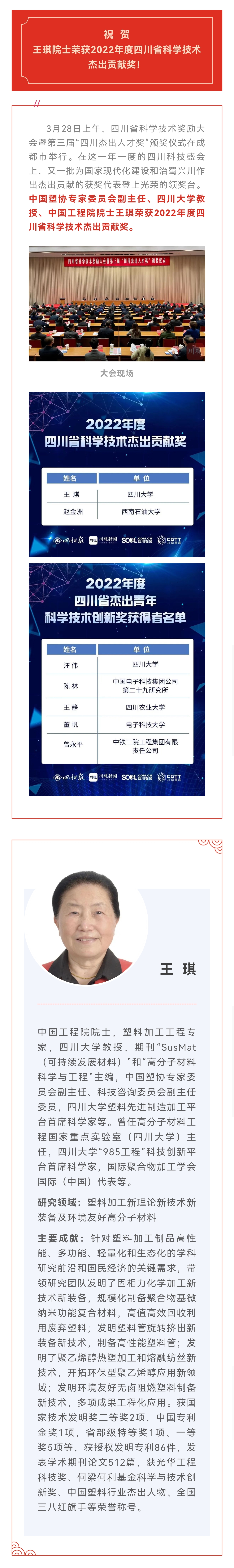 祝贺!中国塑协专家委员会副主任王琪院士荣获2022年度四川省科学技术杰出贡献奖!