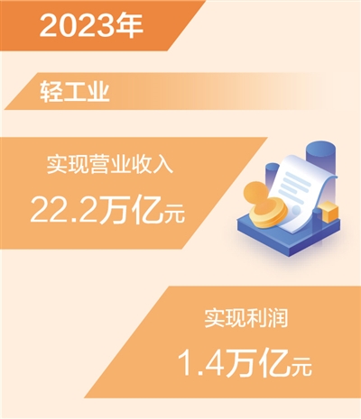 本报北京2月21日电 (记者韩鑫)中国轻工业联合会近日发布数据显示,2023年我国轻工业实现营业收入22.2万亿元,同比增长1.6%,实现利润1.4万亿元,同比增长3.8%。轻工业以占全国工业13.2%的资产,实现了全国工业16.7%的营业收入和18.1%的利润,有力支撑工业经济稳定发展。