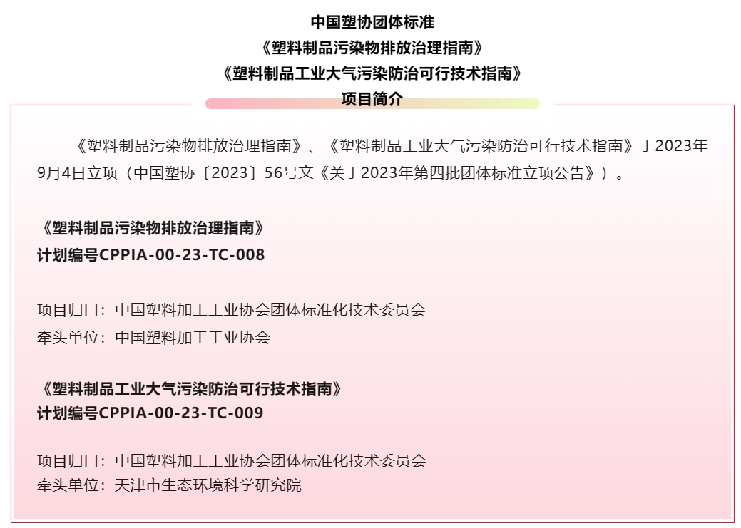 《塑料制品污染物排放治理指南》、《塑料制品工业大气污染防治可行技术指南》两项团体标准的启动,标志着中国塑料加工工业协会组织、推动行业从技术、标准层面解决困扰行业的环保问题工作的正式开始。有利于防治限值和技术要求,有指导和依据地选取性价比合理的环保技术和设备,减少环境污染的同时降低自身资源浪费,实现可持续高质量发展。