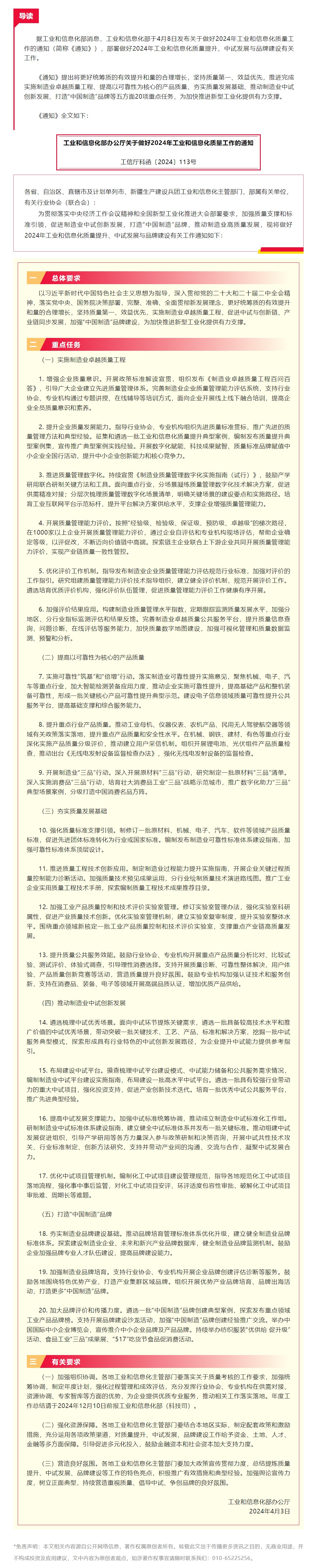 政策速递 | 工业和信息化部办公厅关于做好2024年工业和信息化质量工作的通知