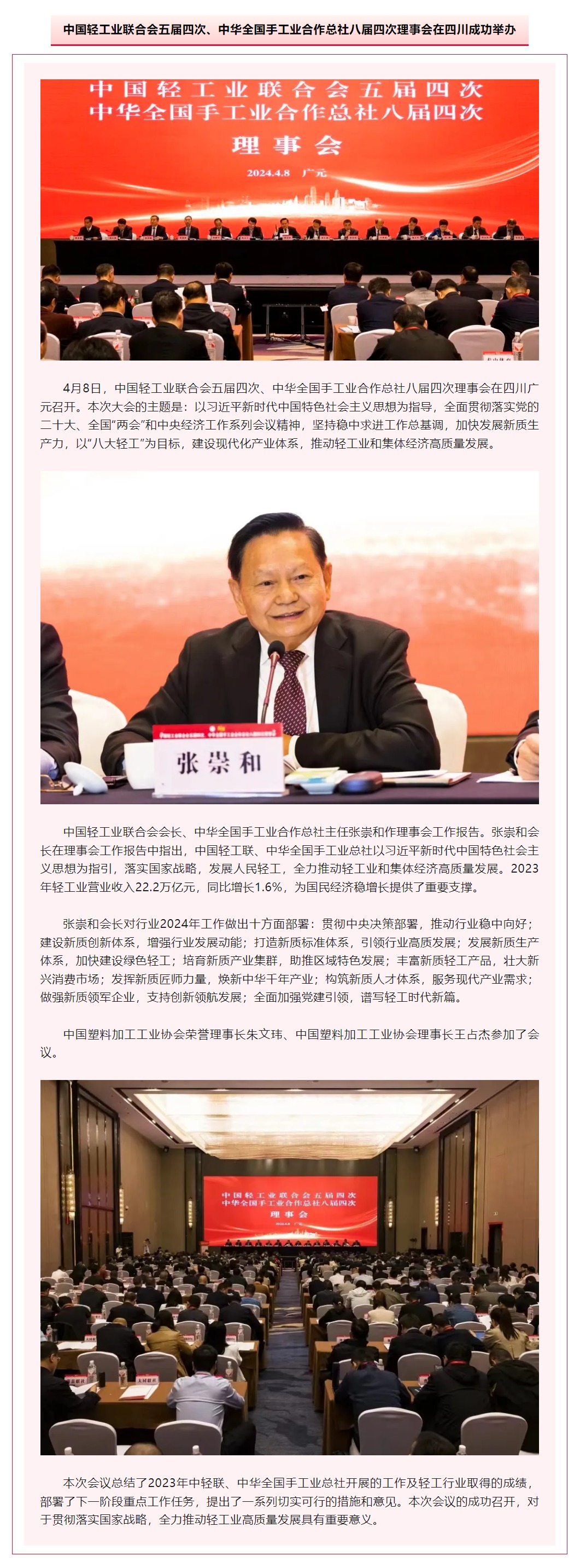 中国轻工业联合会五届四次、中华全国手工业合作总社八届四次理事会在四川成功举办