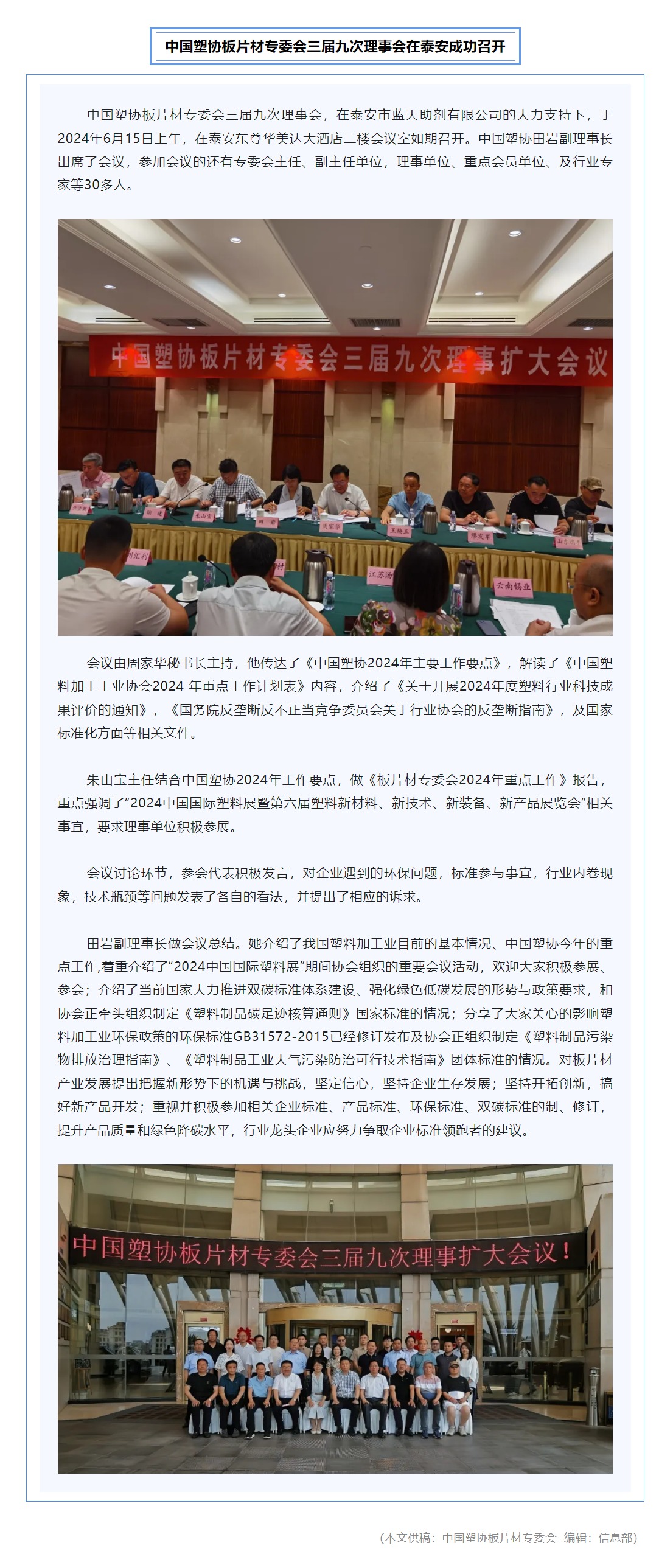 中国塑协板片材专委会三届九次理事会在泰安成功召开