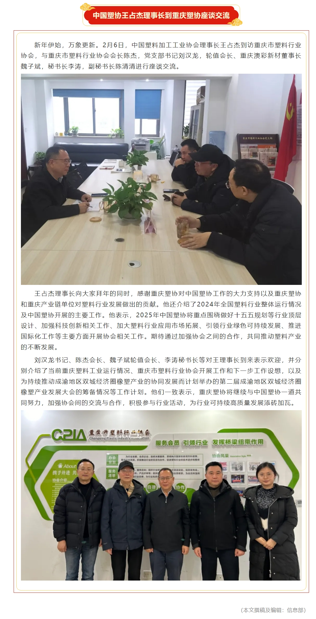 中国塑协王占杰理事长到重庆塑协座谈交流