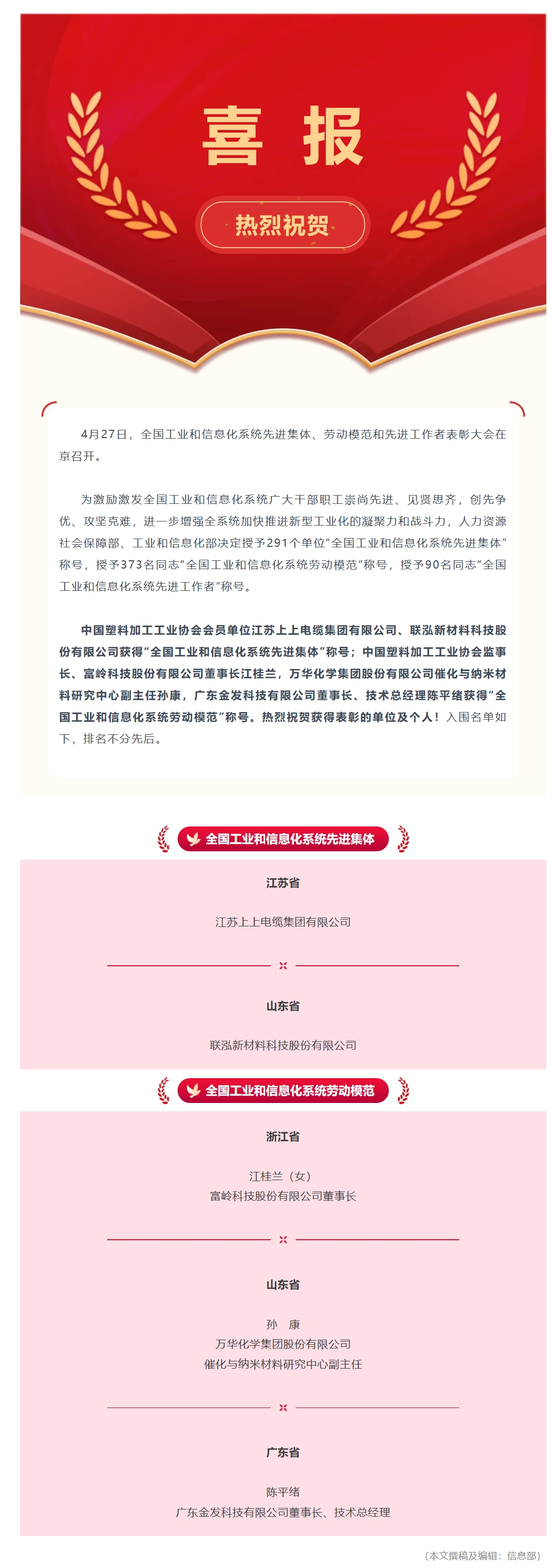 祝贺多家会员企业及个人获得全国工业和信息化系统先进集体、劳动模范表彰!